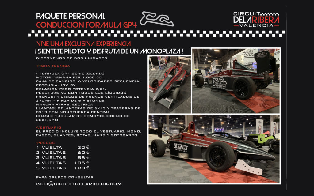 Quien no ha deseado conducir en alguna ocasión una autentica maquina de la velocidad? Pues ahora es el momento de quitarte esa espinita, Circuit de la Ribera pone a disposición de sus clientes auténticos formula GP4 serie Gloria. Con un moto Yamaha FZR 1000CC.